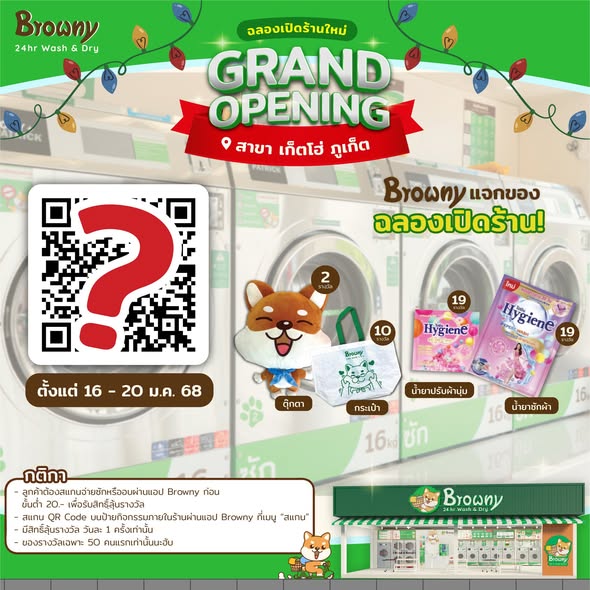 Browny Wash & Dry สาขาอะพาร์ตเมนต์ เก็ตโฮ่ ภูเก็ต พร้อมเปิดให้บริการอย่างเป็นทางการแล้วนะฮับ! น้องชิบะจัดเต็มโปรโมชั่นเพื่อคนรักความสะอาดโดยเฉพาะ
