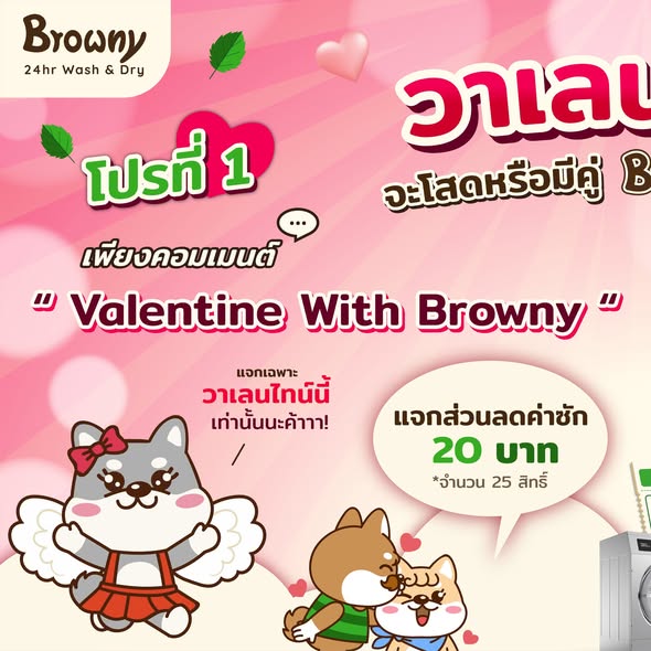 วาเลนไทน์ปีนี้ Browny 24hr Wash & Dry ขอเป็นกามเทพมอบความรักผ่านความสะอาดฮับ! ไม่ว่าคุณจะโสดหรือมีคู่ เราก็มีอั่งเปาความรักมาแจกให้ถึง 2 ต่อ จัดเต็มทั้งกิจกรรมหน้าเพจและโปรโมชันสุดคุ้มในแอปฯ ใครไม่อยากพลาดความรัก (และส่วนลด) รีบมาดูกติกาเลยฮ้าบบบ