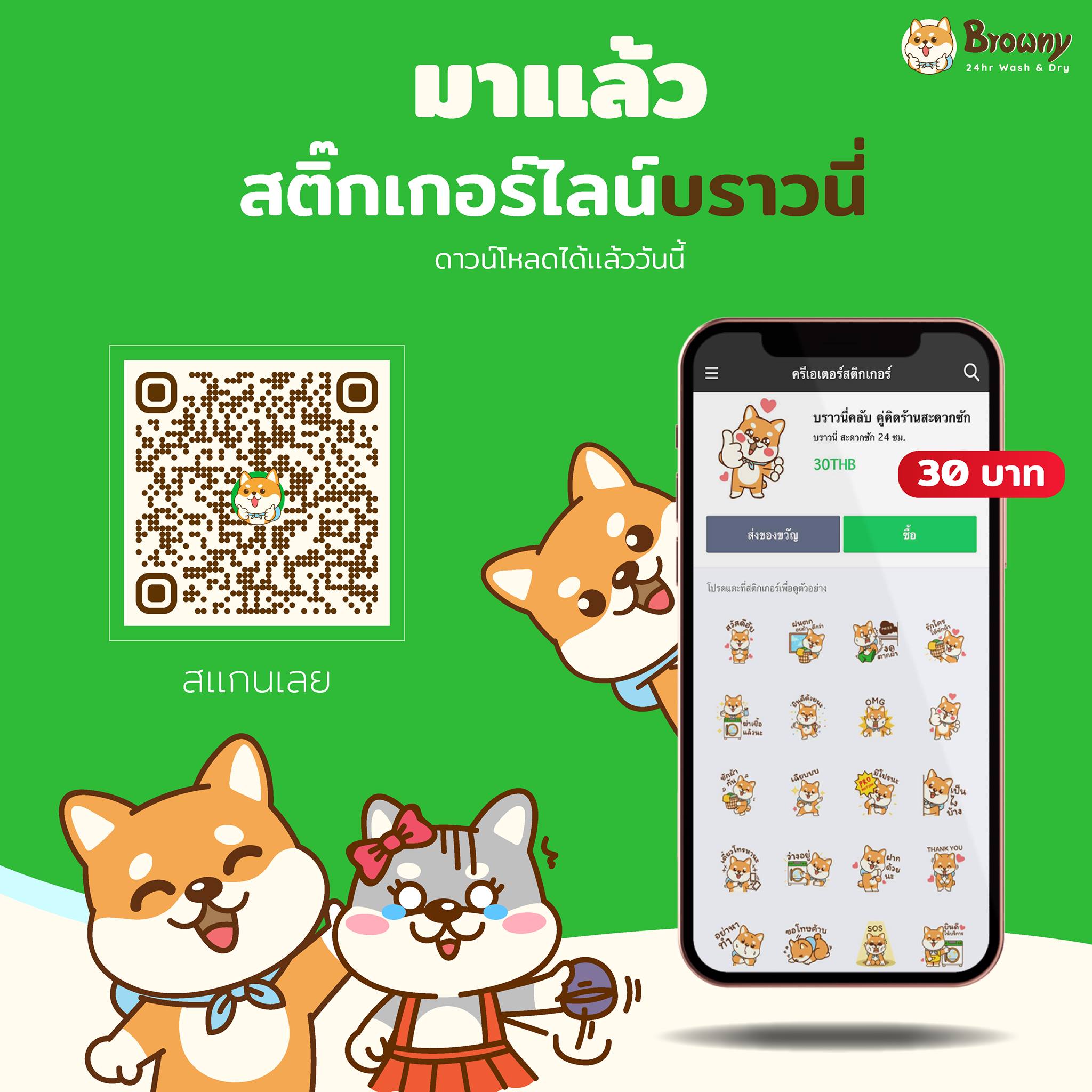 จะบอกฝันดี หรือขอบคุณที่ช่วยตากผ้าให้ ก็ส่งความรู้สึกผ่านน้องชิบะ Browny ได้ทุกสถานการณ์ กับสติกเกอร์ไลน์คอลเลกชัน “Browny Club” ที่รวมท่าทางกวนๆ ปนน่ารักของมาสคอตประจำร้านสะดวกซักที่คุณไว้วางใจมาไว้บนหน้าจอ