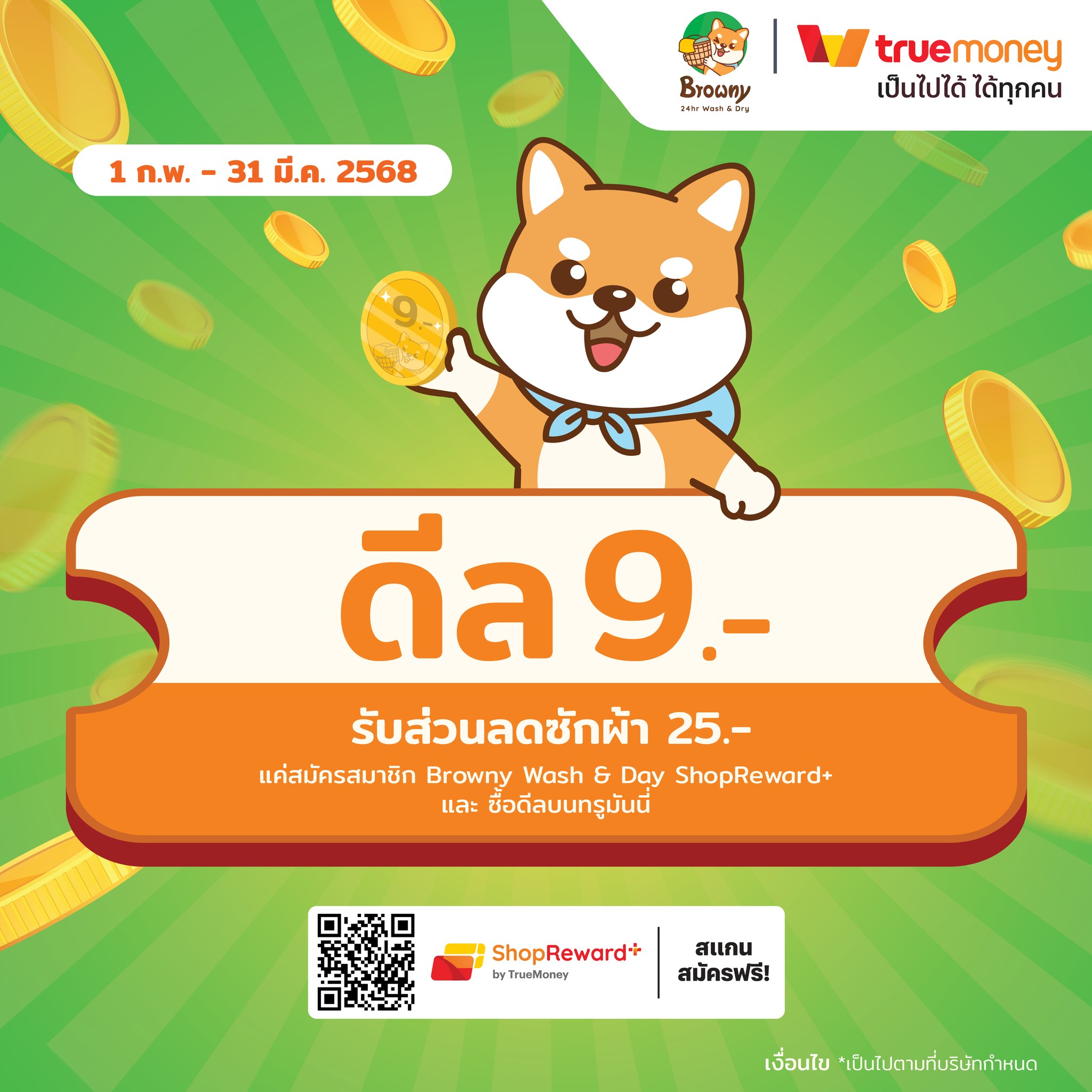 คุ้มกว่านี้ไม่มีอีกแล้วฮับ! Browny 24hr Wash & Dry ร่วมมือกับ TrueMoney มอบของขวัญพิเศษให้คนรักผ้า ซักผ้าเริ่มต้นเพียง 9 บาท เท่านั้น! ไม่ว่าจะผ้ากองโตแค่ไหน ก็ประหยัดงบได้แบบจุกๆ เพียงซื้อดีลสุดคุ้มผ่านแอป TrueMoney แล้วมาใช้บริการที่สาขาทั่วประเทศ* ตั้งแต่วันนี้ ถึง 31 มีนาคม 2568 นะฮ้าบบบ
