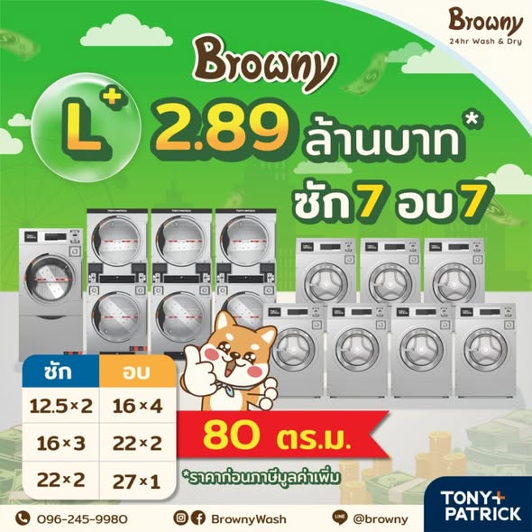 ลงทุนอย่างมั่นใจกับแฟรนไชส์ Browny Wash & Dry ครบจบ 3 แพ็กเกจ [S / M+ / L+] ดูแลฟรีทั้งค่าแรงและอะไหล่!
