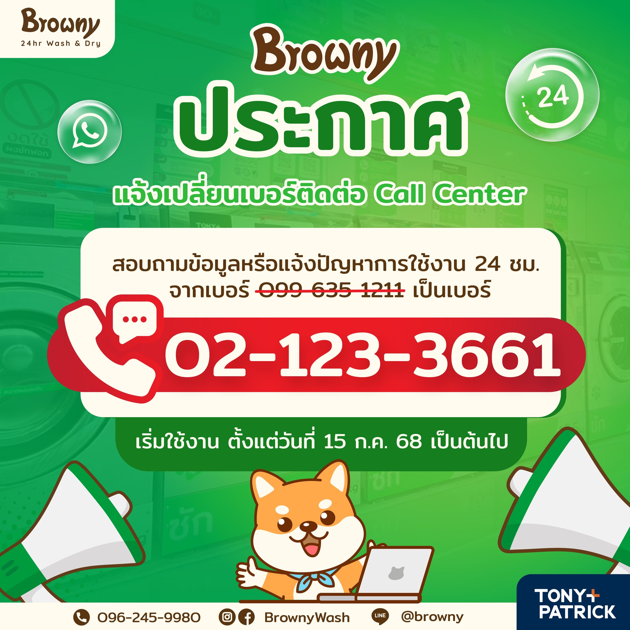 เพื่อให้การดูแลลูกค้าของ Browny 24hr Wash & Dry เป็นไปอย่างต่อเนื่องและมีประสิทธิภาพมากยิ่งขึ้น ทางแบรนด์ขอแจ้งเปลี่ยนเบอร์โทรศัพท์สำหรับติดต่อ Call Center ตั้งแต่วันนี้เป็นต้นไป