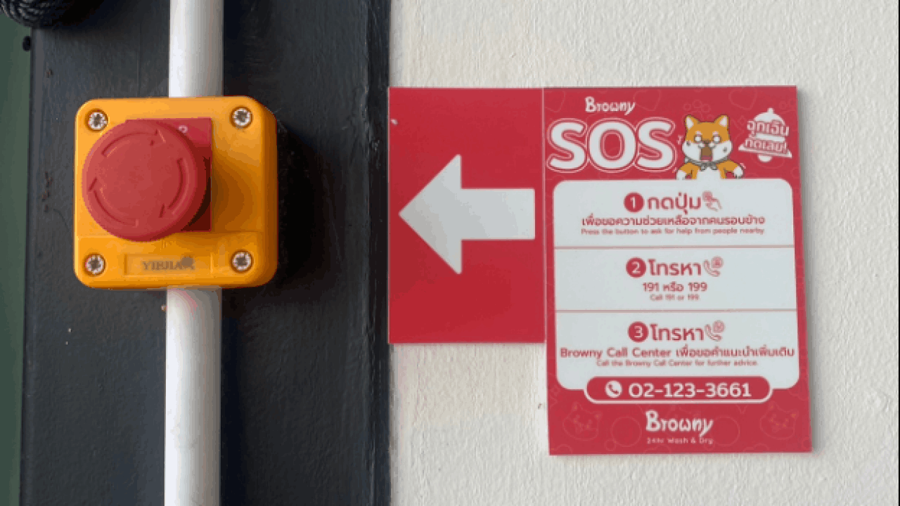 Browny รักคนซักผ้า มากยิ่งขึ้นด้วยการเพิ่ม “ปุ่มฉุกเฉิน” ภายในร้าน โดยเมื่อมีการกดปุ่ม สัญญาณไฟฉุกเฉินและเสียงไซเรนจะดังสนั่นไปทั่วบริเวณร้านเพื่อร้องขอความช่วยเหลือได้ทันที และในอนาคต Browny ยังมีแผนพัฒนาให้ปุ่มฉุกเฉินเชื่อมต่อกับ Browny Call Center โดยตรงเพื่อประสานงานความช่วยเหลือให้รวดเร็วยิ่งขึ้น